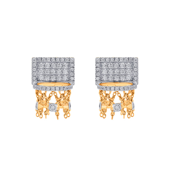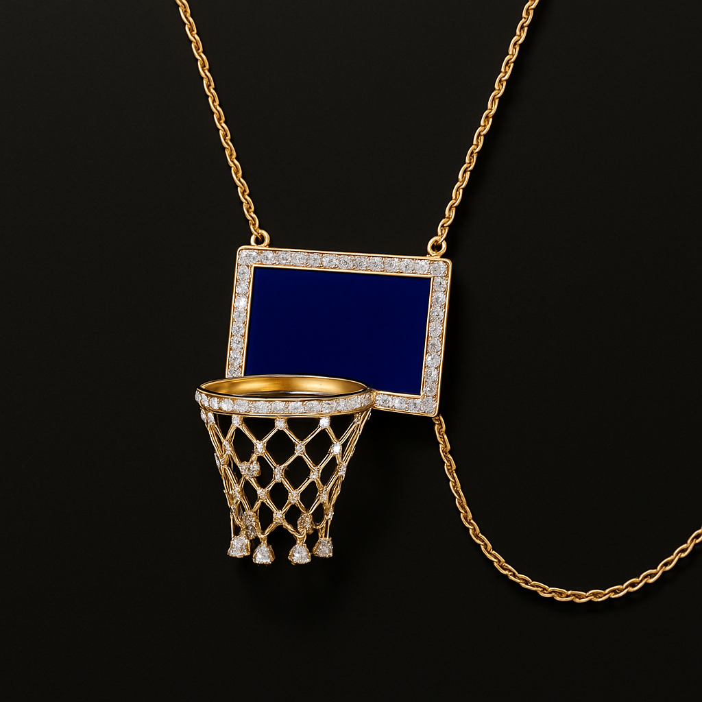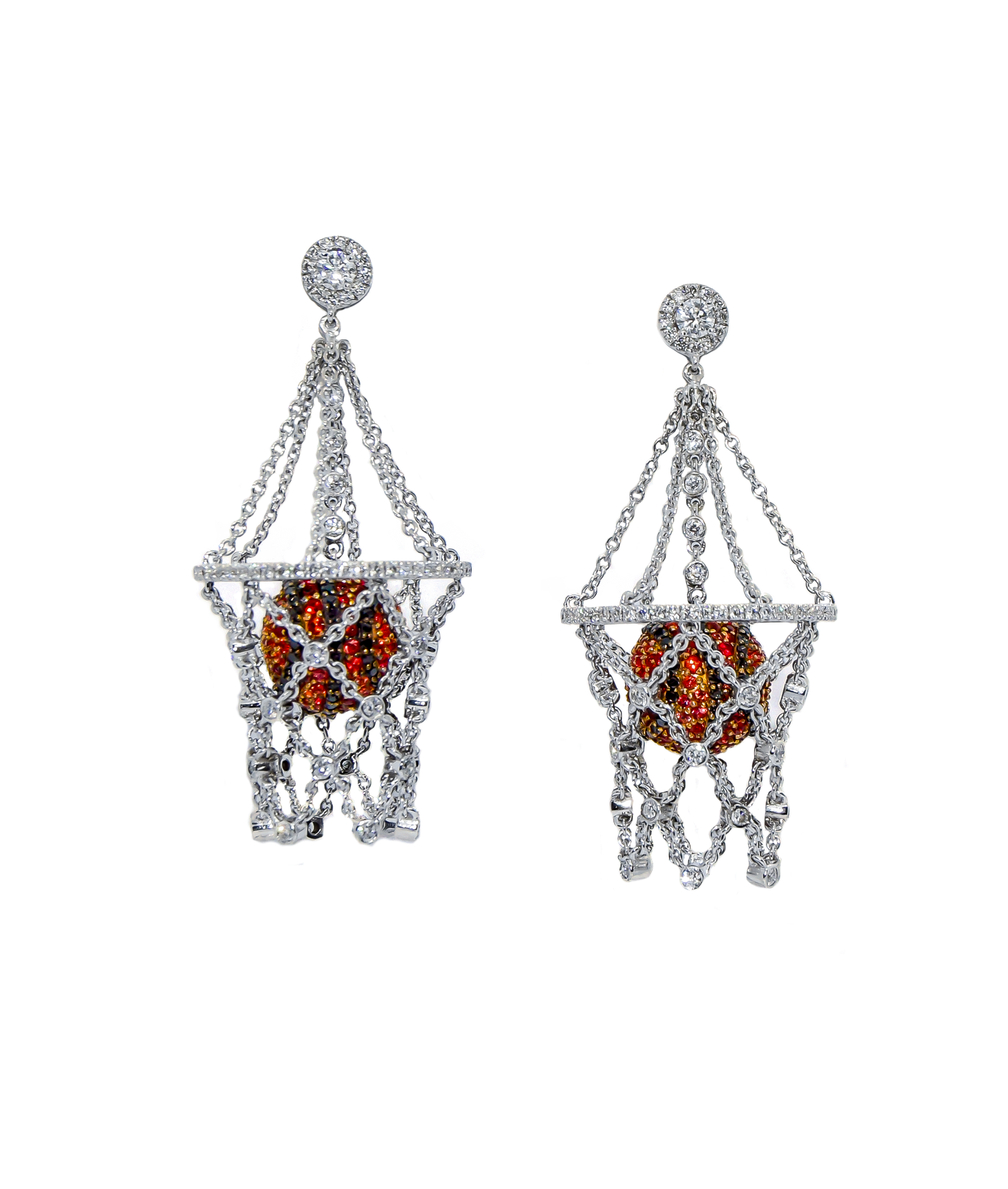 Suspended below, a fully dimensional hoop and diamond-set net drape with fluid precision, each link articulated to move with light and grace.