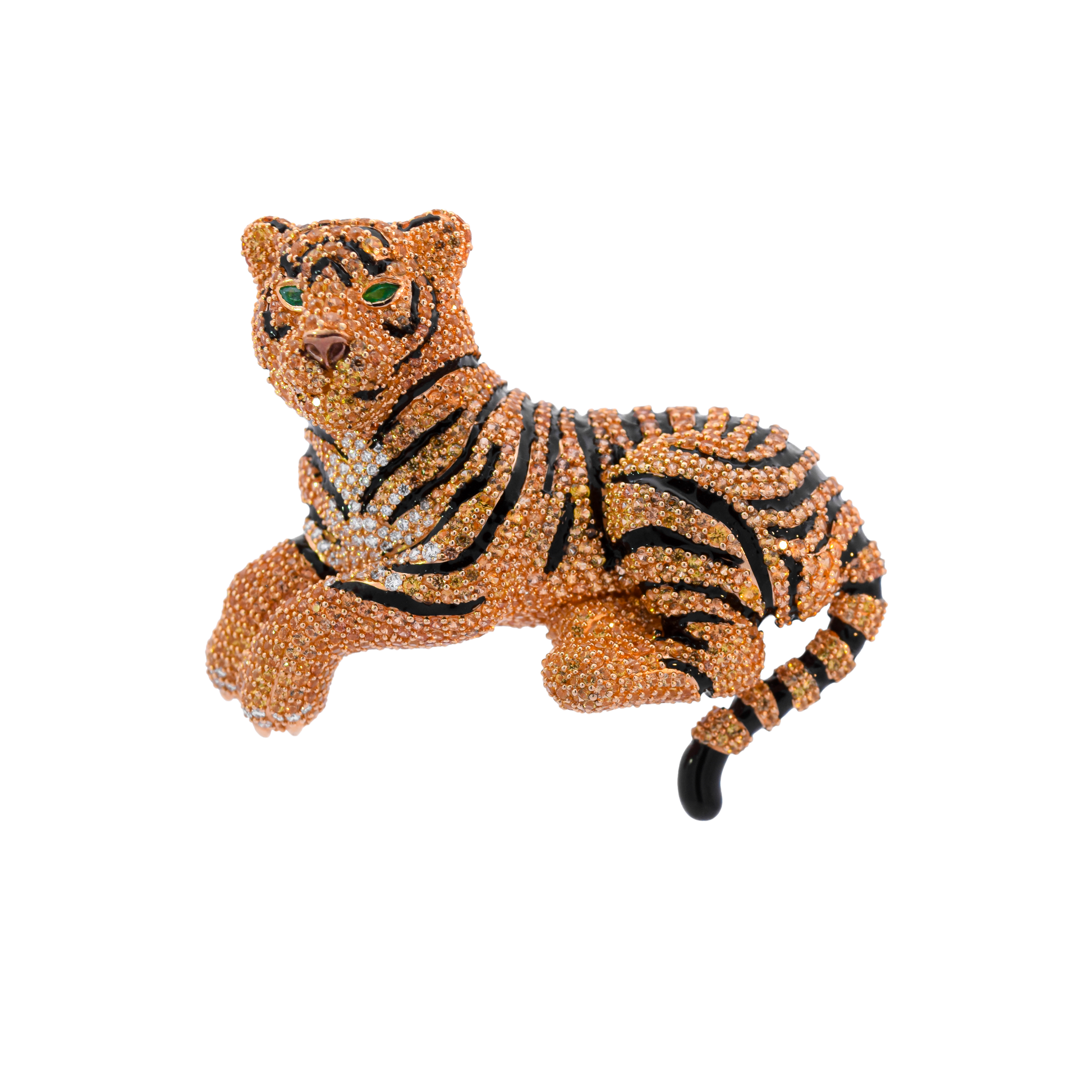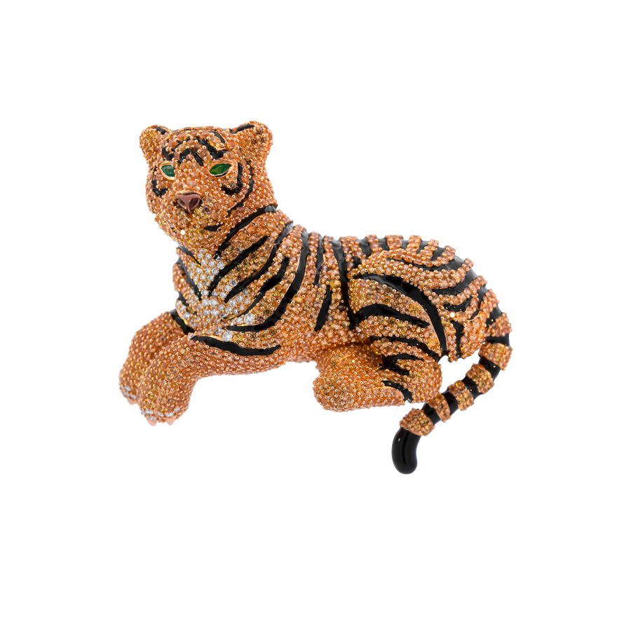 A masterpiece of untamed elegance and apex craftsmanship. The Bengal Tiger Customized Bag Bijoux is a fierce statement of power, meticulously sculpted in solid 18K Yellow Gold. Its magnificent coat is brought to life through a breathtaking, intricate pavé setting of fiery Orange and vivid Yellow Sapphires, powerfully contrasted by brilliant white diamonds. The piercing gaze of the tiger is captured with vivid marquise-cut Emeralds, creating an aura of captivating wild majesty.