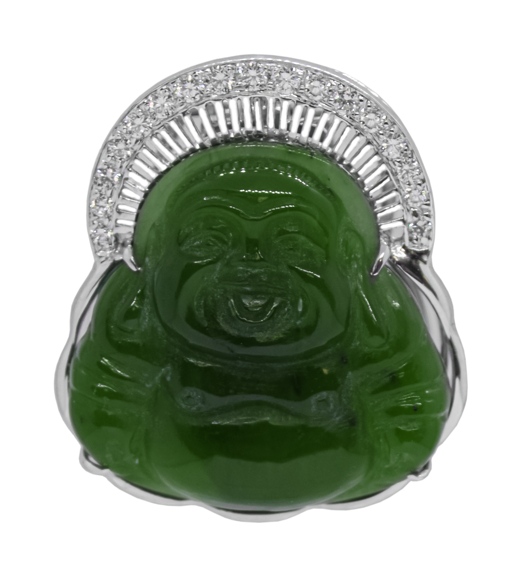 Design: Buddha motif with jade centerpiece and pavé diamond detailing