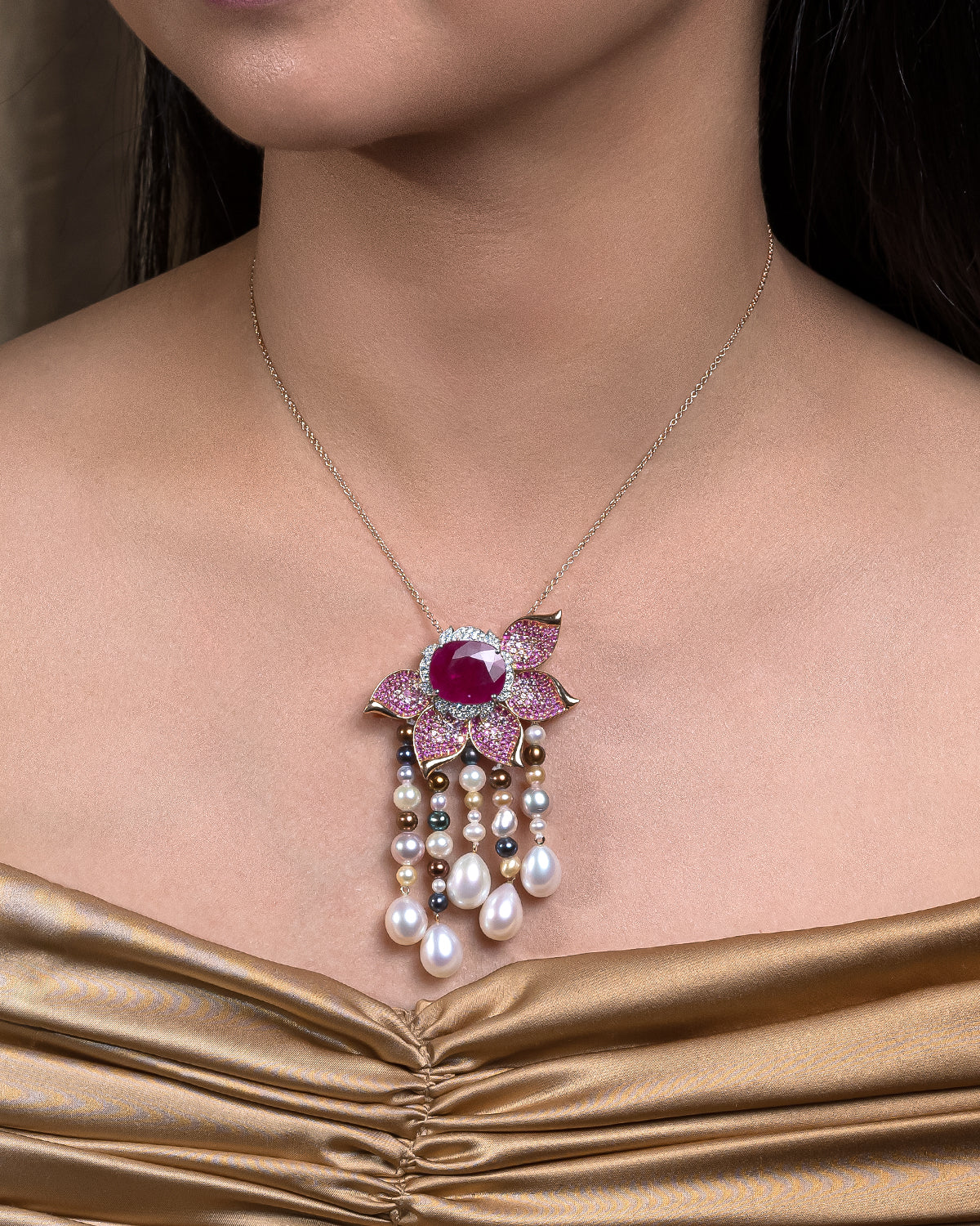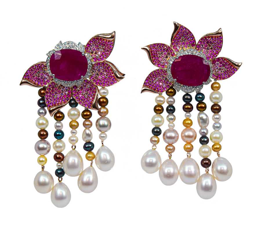 Where nature meets opulence. The Flower Bag Bijoux is a blooming masterpiece, delicately crafted in 18K rose gold and adorned with a striking ~10.00ct natural Mozambique ruby, pink sapphires, FG/VVS-VS diamonds, and freshwater pearls. Designed by Ashna Mehta, this exquisite floral creation celebrates beauty, femininity, and timeless elegance through its vibrant palette and intricate design.