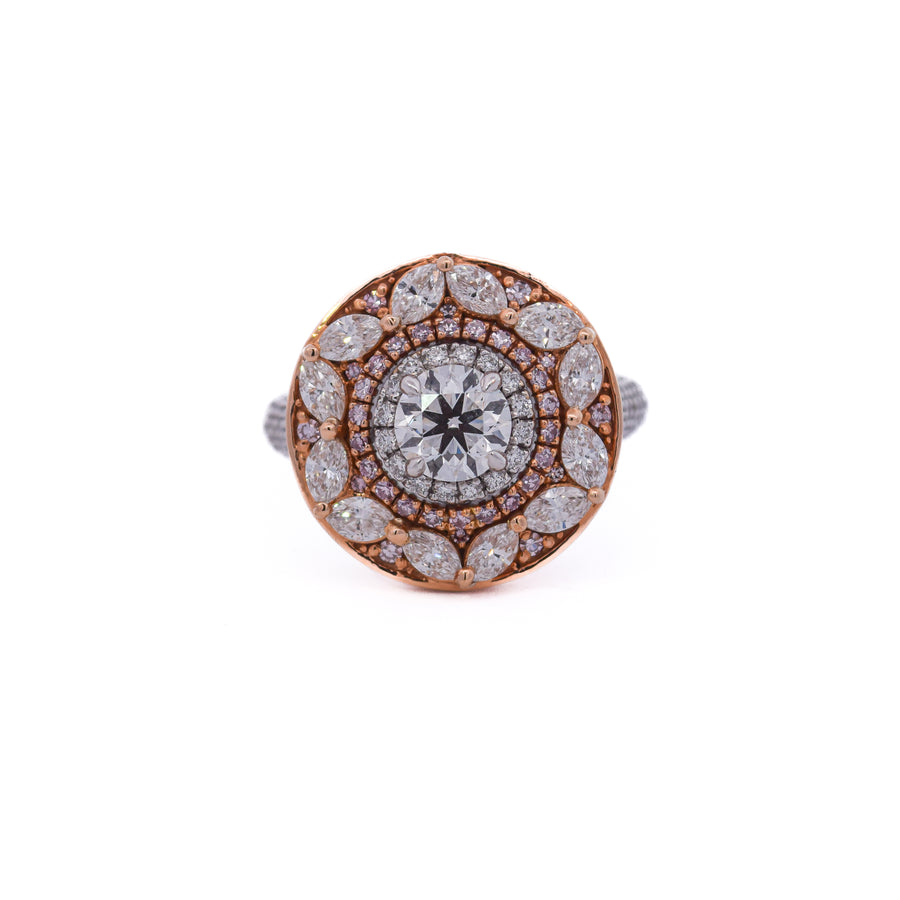 Experience a masterful blend of color and geometry. This exquisite ring by Ashna Mehta elevates the classic round solitaire by flanking it with elegant marquise cuts and rare pink diamond accents, creating a sophisticated, multi-dimensional sparkle.